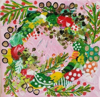 Create a 10 x 10 Festive Wreath using not just acrylic paint with paint brushes; but many familiar painterly items as well as stamps, hot glue, cardboard, plus embelishments.